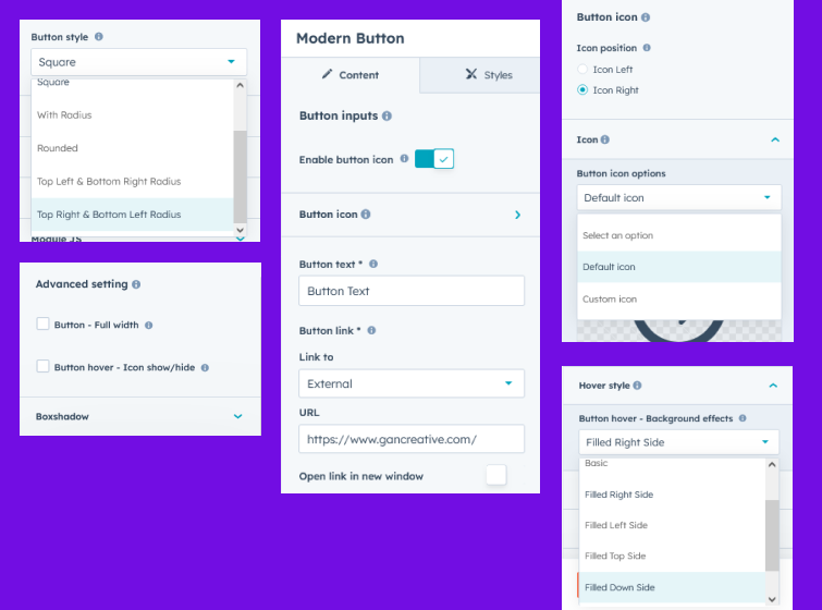 - Button Style: Button style such as "Square", "With Radius", "Rounded", "Top Left and Bottom Right Radius" and "Top Right and Bottom Left Radius" are supported.