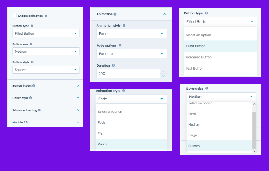 - Button Size: Offers various sizes (small, medium, large and Custom) and shapes (rectangular, rounded, pill) for flexible design.