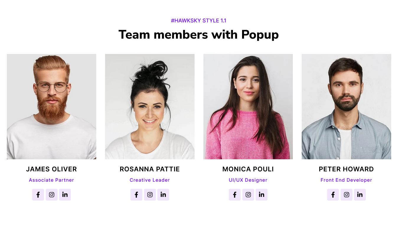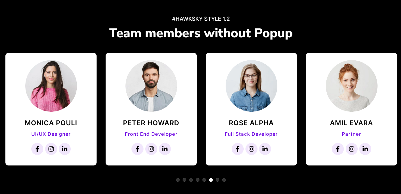 - Popup/Without Popup: You can present your team role and skill with popup or without popup. And the popup window style can be extremely customized.