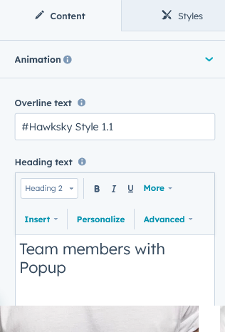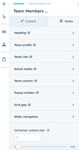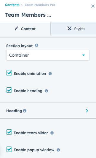 Under “Content”, you can edit the content you want to be displayed on your Team members Pro section. Easily adjust and update the “Section layout”, "Enable heading", "Heading animation", "Enable team slider", "Enable popup window", "Team items", "Team items' animation", "Ordering elements", "Team information", "Team popup description" and more as you please.