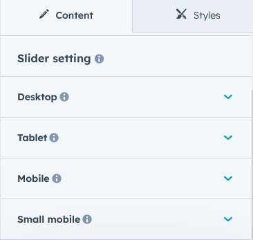- Slider setting: Slider customization options are accessible across desktop, tablet and mobile.