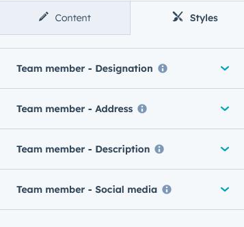 - Team designation: This group contains the style of a team member's designation text.